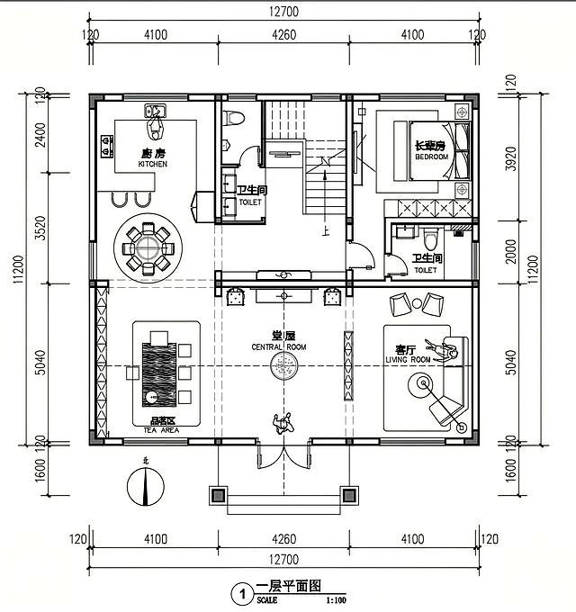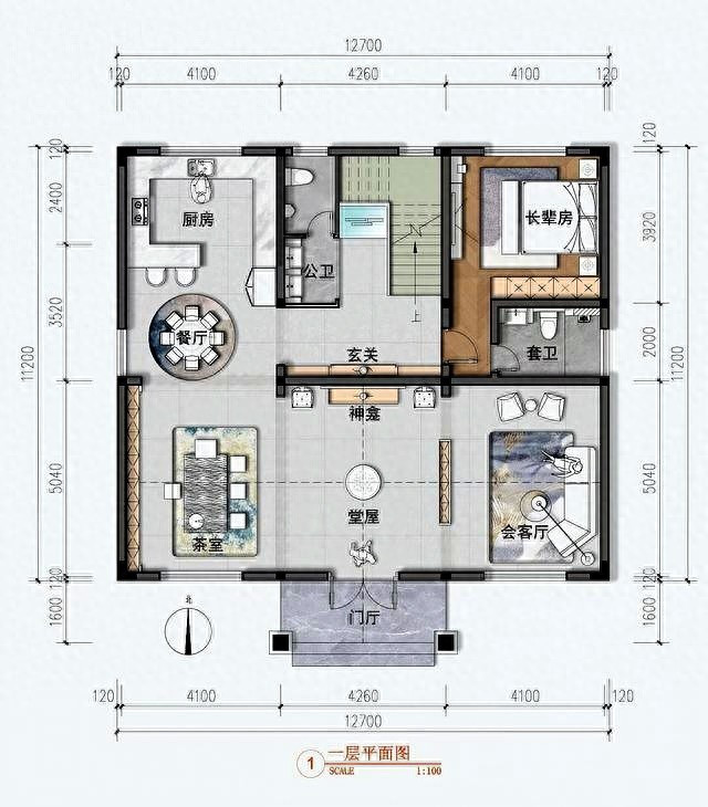 进门就是堂屋,两侧分开茶室和会客厅,餐厨放在西北角,东北角留给老人房还带独卫,楼梯下把卫生间也用上了。